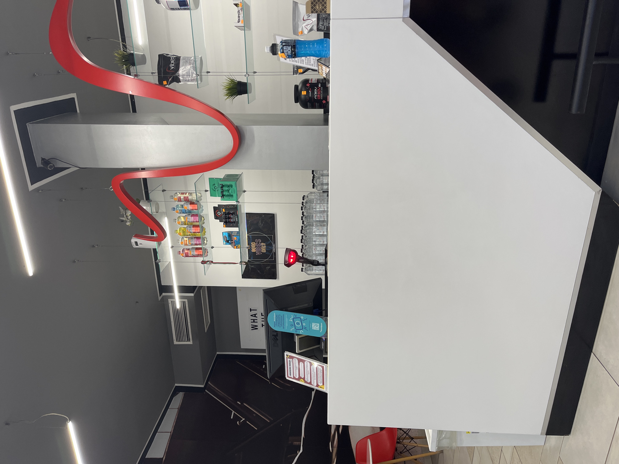 The image depicts the interior of a retail space, possibly a gym or a health food store, in Sofia, Bulgaria. The main focus is on a large white counter or reception desk, positioned prominently in the foreground. Behind the counter are shelves displaying a variety of health-related products such as supplements, protein powders, and energy drinks. A red, curved decorative element is suspended from the ceiling. A computer monitor and various point-of-sale materials, including signage and menus, are on the counter. The environment includes a view into the store with an air vent on the wall and black and gray walls. A red chair is visible in the lower portion of the image.