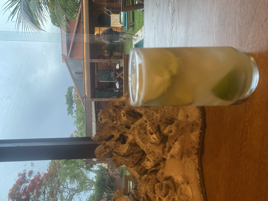 A refreshing beverage, likely a cocktail, sits in a clear glass on a textured surface. The drink contains lime slices and appears to be ice-cold. Outside the window, a glimpse of a tropical setting is visible, featuring palm trees and a building with an open veranda. The overall scene suggests a relaxing vacation spot.