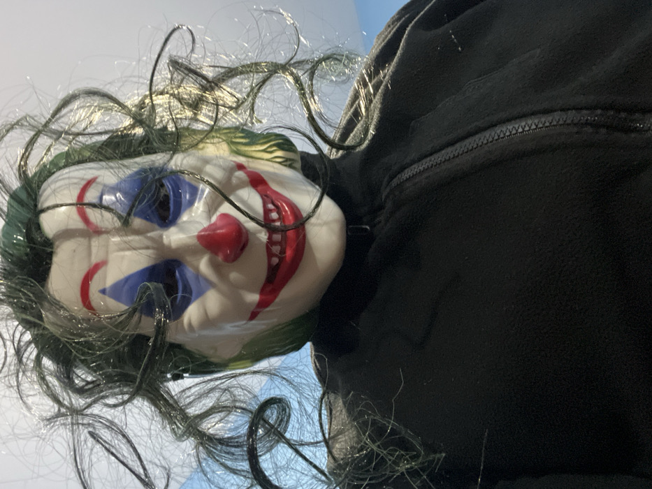 The scene, located in Ouaouizert, Morocco, captures a close-up, low-angle perspective of an individual wearing a mask and jacket. The primary subject is a white-faced plastic mask styled after the Joker character, featuring a wide red painted grin exposing teeth, a spherical red nose, and blue diamond-shaped markings below the eye cutouts. Red arched eyebrows are painted above the eye openings. Attached to the mask is a disheveled, curly green wig, with strands of hair splaying outwards. The individual is wearing a black, full-zip jacket made of a fleece-like material, with the dark zipper visible running vertically down the center. The background consists primarily of a light-colored ceiling, with faint hints of a light blue patterned surface visible towards the upper left.