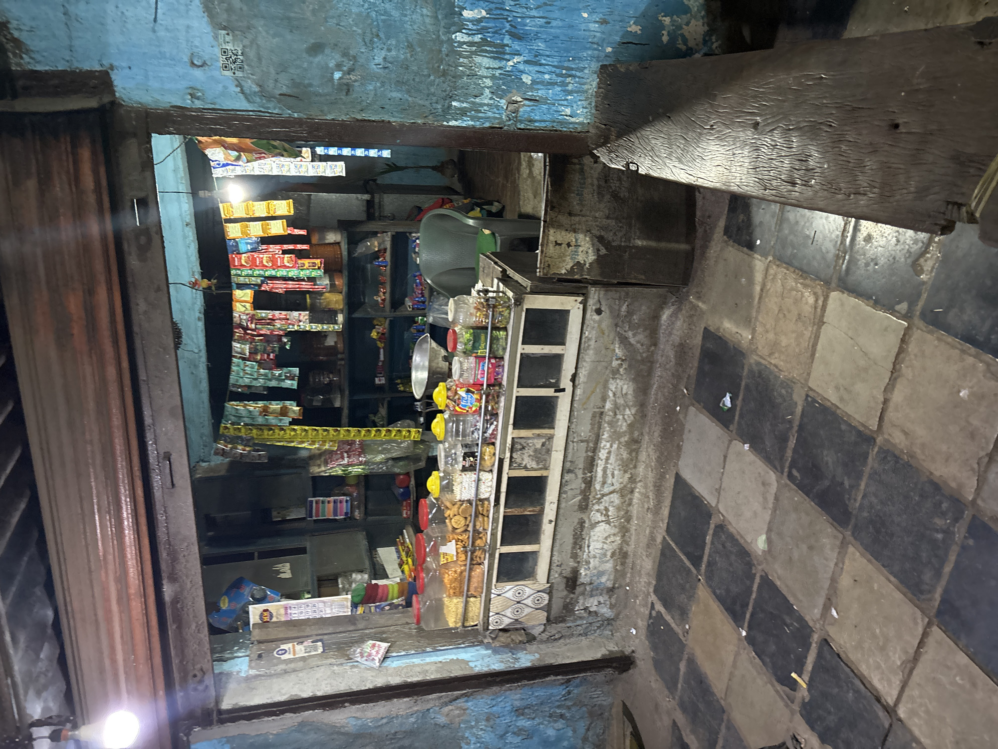 This image depicts the entrance of a small retail shop, likely a snack or general store, in Ulhasnagar, India