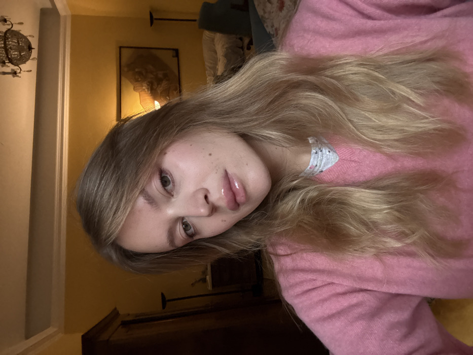 A light-skinned individual, appearing female, with shoulder-length, wavy blonde hair, green eyes, and pink, glossy lips, is depicted in a portrait-style image looking directly at the camera. The individual wears a light pink V-neck sweater over a white undergarment patterned with small grey shapes. The scene is an indoor residential setting, characterized by mustard yellow walls and a white ceiling with visible molding. An ornate, crystal chandelier hangs from the ceiling, and warm artificial lighting illuminates the room. To the left of the subject, a tall, dark wooden wardrobe and a dark-colored floor lamp are partially visible. Behind the subject's right shoulder, a framed artwork displaying abstract forms with warm tones is mounted on the wall. Another dark floor lamp stands near the artwork. Portions of a light-colored sofa or chair and a blue-green armchair are discernible in the background. Regarding the specific location within the city of Genoa, Italy, the image lacks any definitive visual identifiers such as landmarks, street signs, or unique architectural features that would allow for a precise forensic determination of its exact geographical placement within the city. The setting is consistent with a private indoor residence.