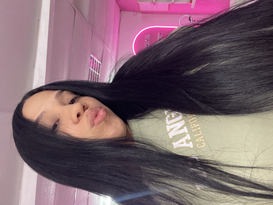 The image displays a single female individual in an indoor commercial setting. The subject has long, dark, straight hair, an olive complexion, and is looking towards the viewer with pursed lips. She is wearing a light olive green ribbed top with partial white lettering, including "ANGE" and "CALIFO". The background consists of white walls and a white ceiling, with a fluorescent light fixture visible overhead. To the right, a prominent arch-shaped pink neon light illuminates shelves containing small bottles, indicative of beauty products. A white circular ring light is also present in this area. These elements suggest the location is a beauty salon or nail studio. The precise location within the city of Altagracia, Venezuela, cannot be determined from the visual information provided.