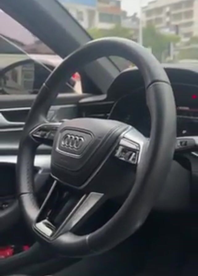 interior of a modern car, likely an Audi, from the driver's perspective. The camera pans from the steering wheel to the dashboard and center console. The steering wheel is black with the Audi logo prominently displayed in the center. The dashboard features a digital display, and the center console has a large touchscreen. A small decorative item hangs from the rearview mirror. The person in the driver's seat is wearing khaki pants. Through the car window, buildings and traffic are visible. The weather appears overcast.