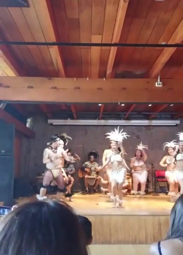 A group of dancers performs on a wooden stage indoors. The dancers, both male and female, wear tribal-style costumes featuring feathers and are barefoot. Behind them, seated musicians play instruments. The stage is lit by overhead lighting. An audience watches from below the stage, with their backs to the camera. The room has a high wooden ceiling and stone walls.