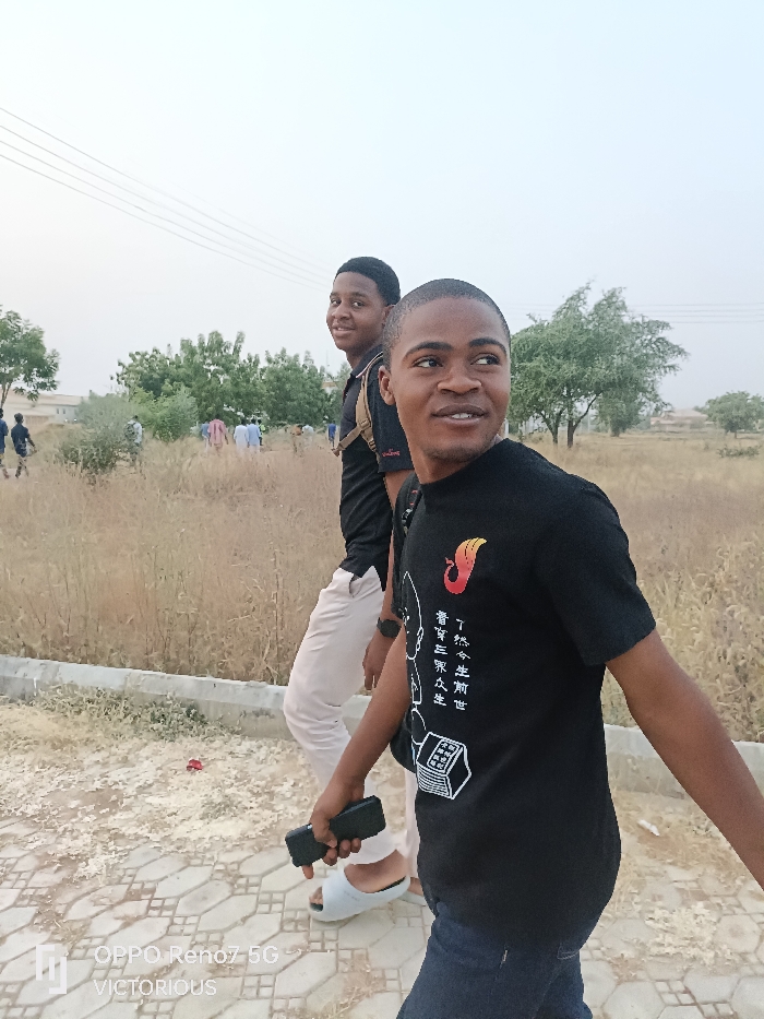 Two young men walk on a paved path alongside a field of dry vegetation. The man in front wears a black t-shirt with a design and blue jeans, holding a phone. His companion, behind him, wears a black shirt and tan pants, with a backpack. In the distance, other people are visible amongst trees and buildings under a hazy sky. The ground transitions from paved path to dirt and dry grass. Power lines stretch across the upper portion of the image.