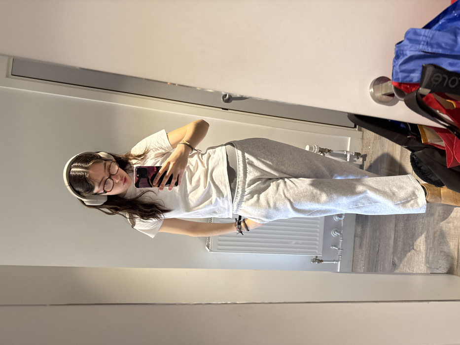 A female-presenting individual with long dark hair, wearing brown-rimmed glasses and white over-ear headphones, is depicted taking a mirror selfie in an indoor residential setting in Hull, United Kingdom. She is dressed in a plain white short-sleeved t-shirt, light grey sweatpants with a visible grey elastic waistband, and light brown ankle boots or slippers. Her left hand is in her pocket, while her right hand holds a smartphone with a dark, patterned case (featuring shades of red, purple, and black) directed towards the mirror. She wears multiple dark bracelets on her left wrist and a single lighter bracelet on her right wrist. Her lips are puckered. The background, as reflected in the mirror, shows a plain light-colored wall. On the lower left, a white panel radiator with exposed copper piping and silver valves is mounted against the wall. The floor is a light-colored wood or laminate. A white doorframe is visible on the far left. On the right side of the reflection, a white door with a silver handle is partially visible, with various items including blue and red fabric bags or garments draped over it.