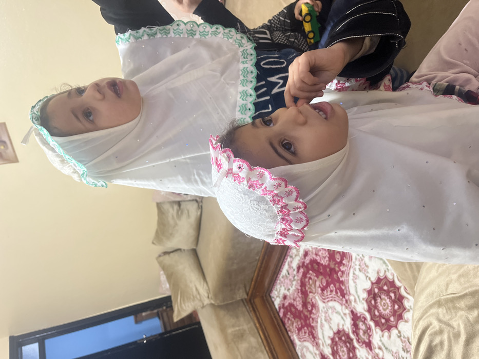Two young girls are wearing white headscarves trimmed in different colors