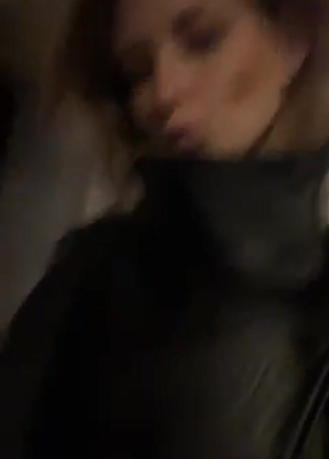 A fair-skinned woman with shoulder-length blonde hair is standing outside at night. She is wearing a black leather jacket and dark jeans. She makes a kissing face at the camera, then smiles. The camera is close to her face. A streetlight is visible in the background. She appears to be standing on a sidewalk.