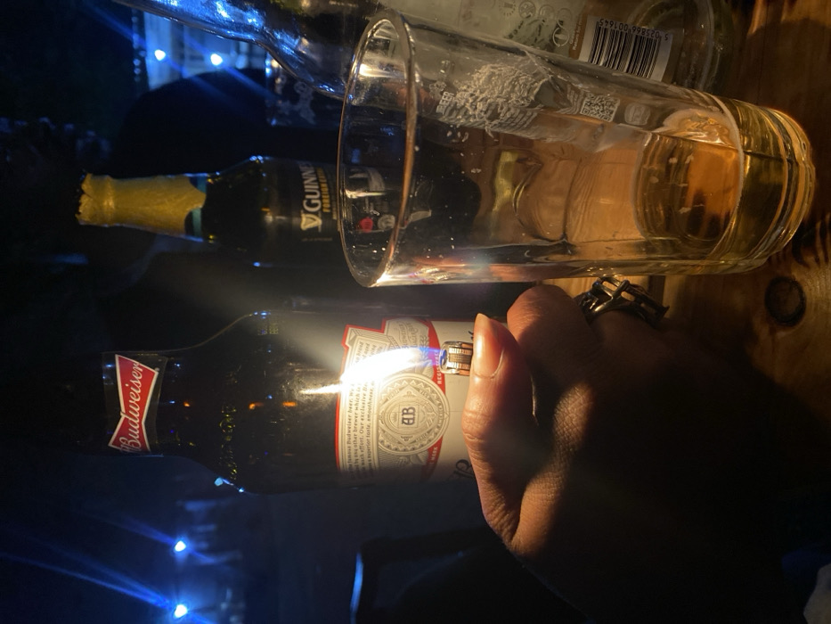 A close-up shows a hand holding a lit lighter near a bottle of Budweiser beer. Several other bottles are visible in the background, including a Guinness bottle and a clear bottle. An empty glass is also present. The setting appears to be a dimly lit bar or table with string lights adding to the ambiance. A ring is visible on the hand holding the lighter.