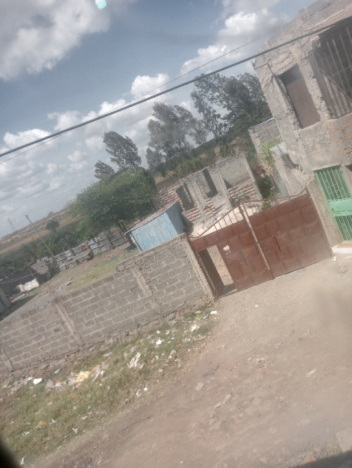 The image depicts an outdoor daytime scene in the city of Unknown, Unknown, captured with a significant upward and rightward tilt. The sky is partially overcast with white and grey clouds; a bright lens flare is visible in the upper center. The foreground consists of an unpaved dirt path on the right, while the lower-left features an area of sparse grass intermixed with various pieces of litter, including plastic bags and paper debris, situated along the base of a low, grey concrete block wall. On the right side of the frame, a two-story structure, appearing unfinished or in disrepair, is constructed from unplastered grey concrete blocks. The upper level features an exposed window opening and vertical metal bars, while the ground level presents a closed, barred green metal door. Central to the image is a large, brown, double-leaf metal gate with vertical reinforcement panels; its left leaf is partially ajar, revealing a narrow pedestrian access point. Behind the low concrete block wall on the left, a blue corrugated metal structure is visible, followed by several grey concrete block foundations or partial structures, indicating ongoing construction or incomplete development. The background reveals additional scattered buildings and trees. A dark utility cable extends horizontally across the upper mid-section of the frame. No individuals are present in the scene, and no explicit actions or interactions are depicted.