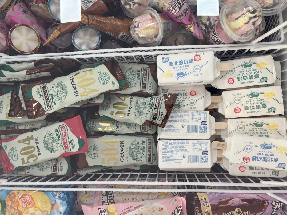 The image displays a top-down view into a commercial freezer unit containing various frozen desserts, situated in a retail environment in Jiayuguan, China