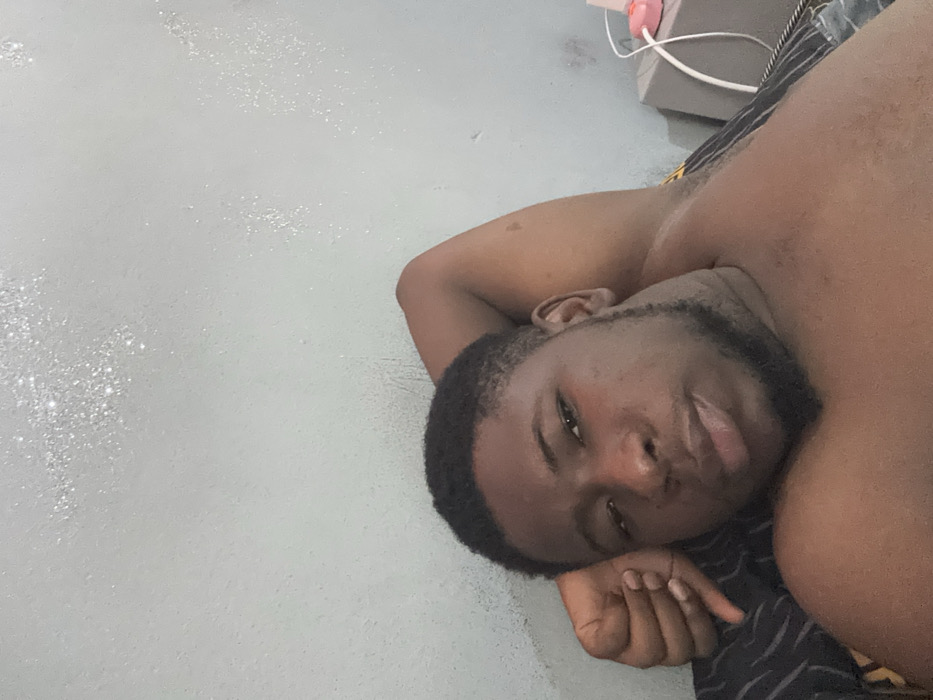 The scene is an indoor environment located in Gbongan, Nigeria. A single adult male individual with a dark complexion, short dark hair, and a full beard is captured from the chest up, lying down. He is shirtless, with his left hand near his head and his right arm bent behind his head, looking directly towards the camera with a neutral expression. The background features a light grey wall with visible reflective glitter particles concentrated in the upper sections. To the subject's left, a dark, patterned fabric is present, consistent with bedding. In the upper right background, a light-colored electronic device with a pink top and a white cable is visible on a darker, rectangular surface.