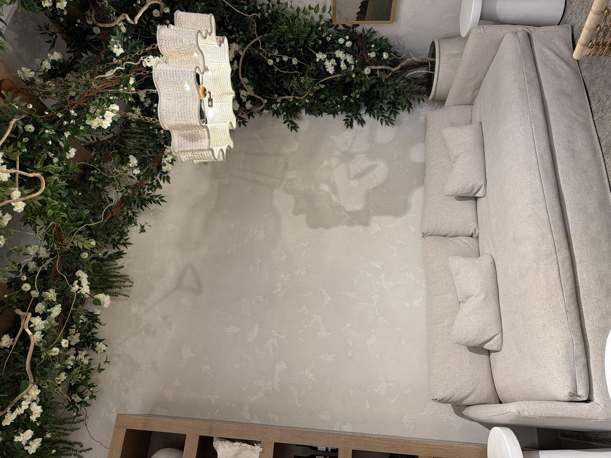 An indoor scene in Las Vegas, United States, displays a contemporary lounge or waiting area. A light beige, upholstered sofa with a skirted base and four matching pillows occupies the lower center. To the left of the sofa, a portion of a light wood bookcase or shelving unit is visible, containing various decorative items and bottles. A small, round white side table stands next to the left armrest of the sofa. To the right, another identical small, round white side table is positioned next to the sofa's right armrest. Behind the right side table, a large potted plant with dark green foliage and white flowers extends upward, partially obscuring a framed landscape artwork on the wall. The wall behind the sofa features a light, textured, off-white finish with irregular, brighter white patches. Overhead, extensive artificial green foliage with white flowers and naturalistic branches covers the ceiling, from which a large, multi-tiered chandelier with woven white material shades hangs, illuminating the space. No individuals are present, and no actions or interactions are depicted.
