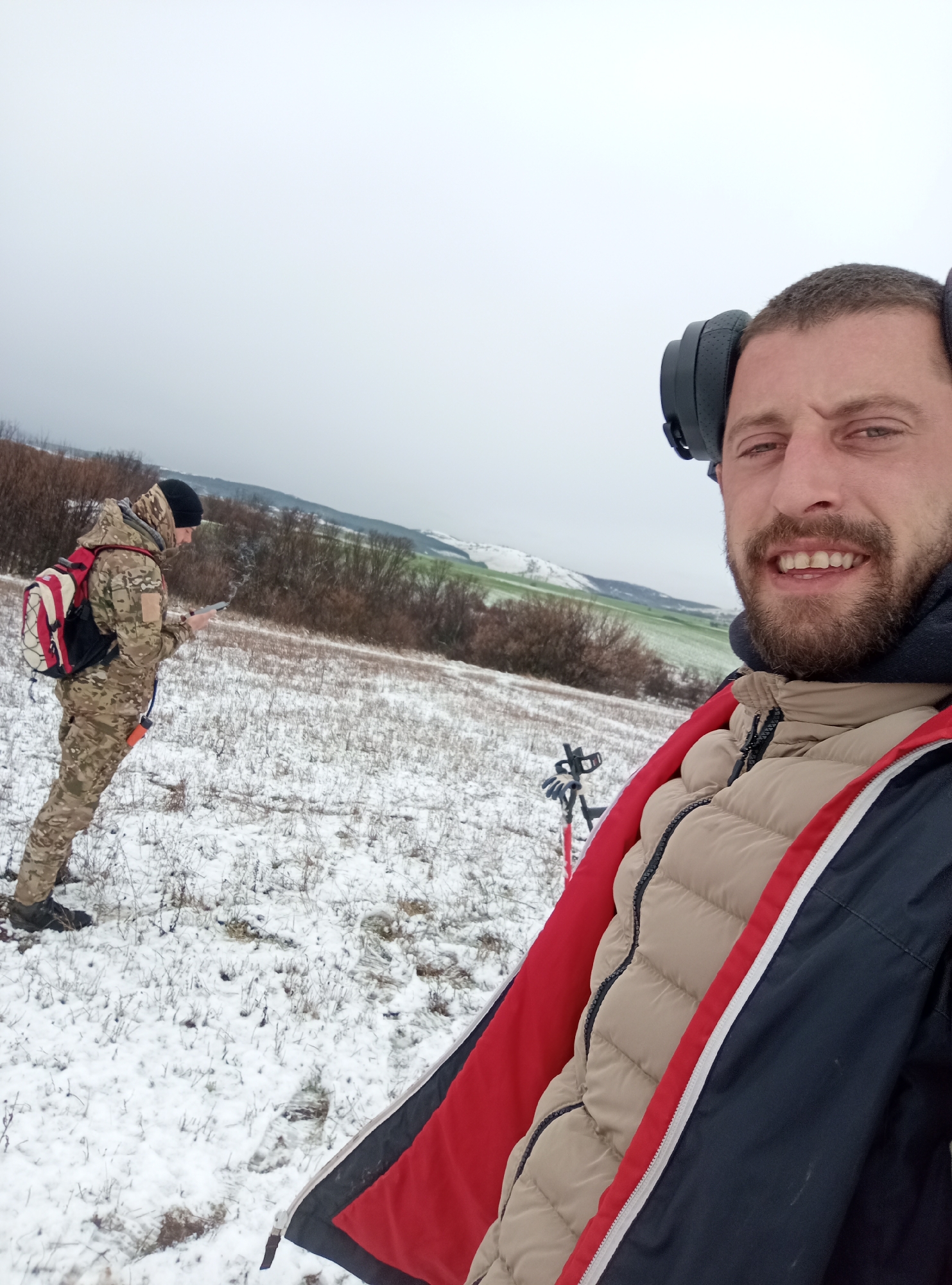 Two adult males are depicted in a snowy open field near the city of Drugan, Bulgaria, under an overcast sky. The individual in the foreground, on the right, is a male with a beard, wearing black over-ear headphones, a beige puffer jacket, and an open navy jacket with red lining. He is smiling and looking directly into the camera. In the mid-ground, on the left, a second male is visible, wearing a black beanie, a hooded camouflage suit, and a red and white backpack. He is holding a small electronic device, possibly a smartphone, in his hands, and a faint plume of vapor is visible near his face. A red/orange object is attached to his lower back. Between the two subjects, a piece of equipment with red poles, potentially a metal detector, is standing in the snow. The ground is covered by a thin layer of snow over sparse dry vegetation. The background features rolling hills with patches of green fields and barren bushes.