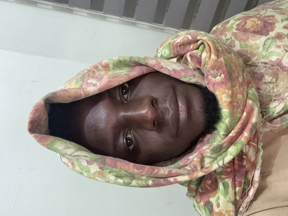 A medium-close-up image depicts a single adult male with dark skin, dark eyes, and a short beard, looking directly at the camera. He is positioned centrally within the frame. His head and upper torso are enveloped in a patterned scarf featuring an arrangement of green leaves and orange/pink flowers against a light background. A segment of a plain, light brown garment is visible beneath the scarf. The background consists of a uniformly painted light-colored wall, possibly off-white or very light green. Vertical blinds are partially visible along the right edge of the frame. The lighting appears even, suggesting an indoor setting. The specific location within the city of Lafia, Nigeria, is not discernible from the visual information presented in the image.