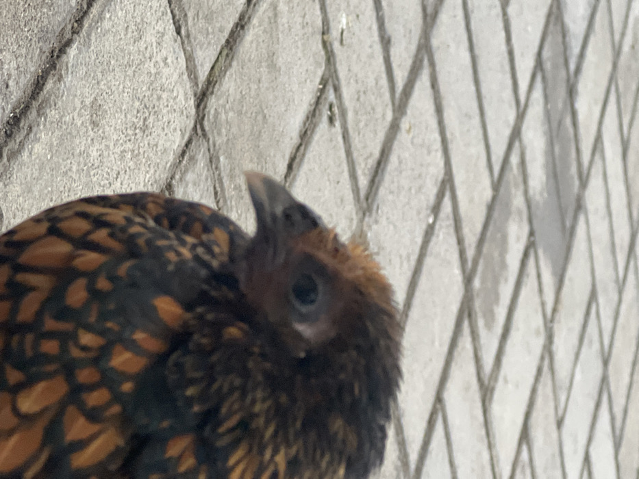 An image captured in Yangihayot, Uzbekistan, depicts a single domestic chicken, partially visible in the lower right foreground. The chicken exhibits a distinct plumage pattern of black feathers with prominent golden-brown or reddish-orange lacing, creating a scalloped effect across its visible body. Its head, positioned in profile facing left, features a small, dark beak and a dark, round eye. The top of its head displays reddish-brown feathering. The background consists of a paved surface made of light-colored rectangular interlocking pavers or bricks arranged in a pattern, with visible grout lines. The paving shows minor surface debris and what appear to be damp patches or reflections. The chicken is stationary, appearing to stand or rest on the paved surface.