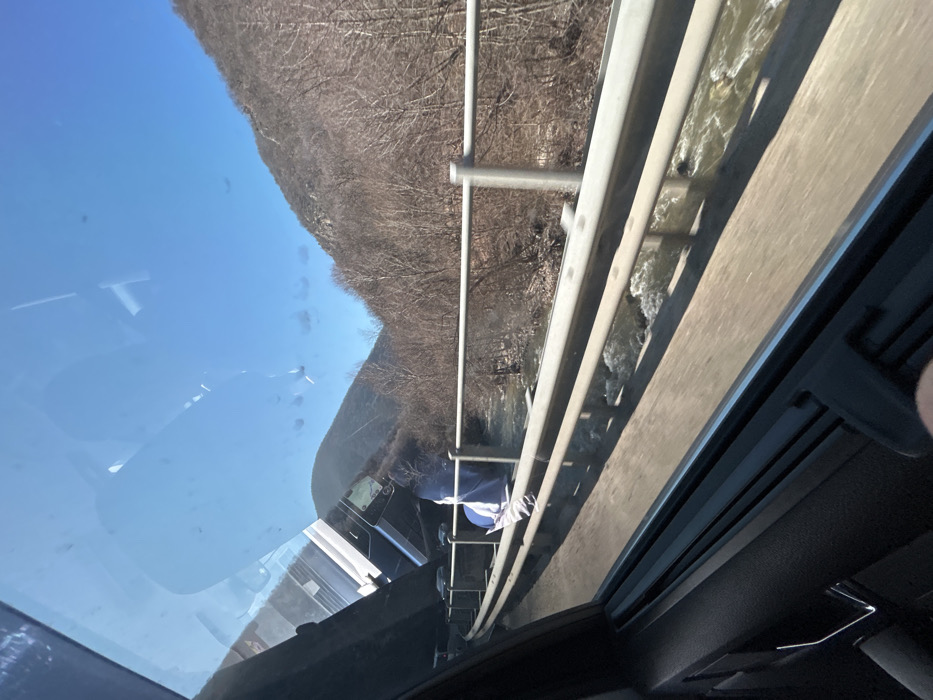 The image depicts a view from inside a moving vehicle, looking outward through a window. The vehicle's dark-colored interior panel and window frame are visible in the lower left. The window glass contains reflections, notably a silver-colored object resembling part of another vehicle or a digital screen in the upper left quadrant. Outside the vehicle, a multi-lane road or highway runs parallel to a metal guardrail and an elevated pedestrian-style railing. A blue and white striped fabric object is draped over the upper railing, positioned approximately in the center-left of the frame. Beneath the road structure, a river with turbulent, brownish-white water flows. The surrounding environment consists of steep, tree-covered slopes, indicative of a mountainous or hilly region. The trees are bare, suggesting a winter or early spring season. The sky above is clear and blue, indicating daytime conditions. The scene is located in a mountainous region in Unknown, Bulgaria. No people are explicitly visible.