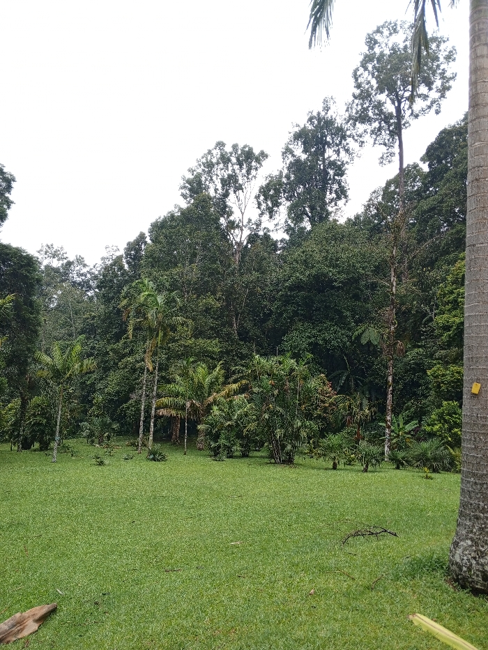 A grassy lawn stretches into a dense tropical forest, merging with the trees at the edge