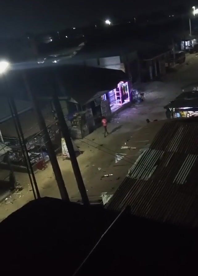 n outdoor scene at night. The view is from an elevated position, possibly a rooftop, overlooking a street with small shops and buildings. The area is illuminated by streetlights, and the shops have colorful neon lights. A person in a red shirt is walking in the street. There is debris and scattered items on the ground. The foreground contains parts of the rooftop and power lines.