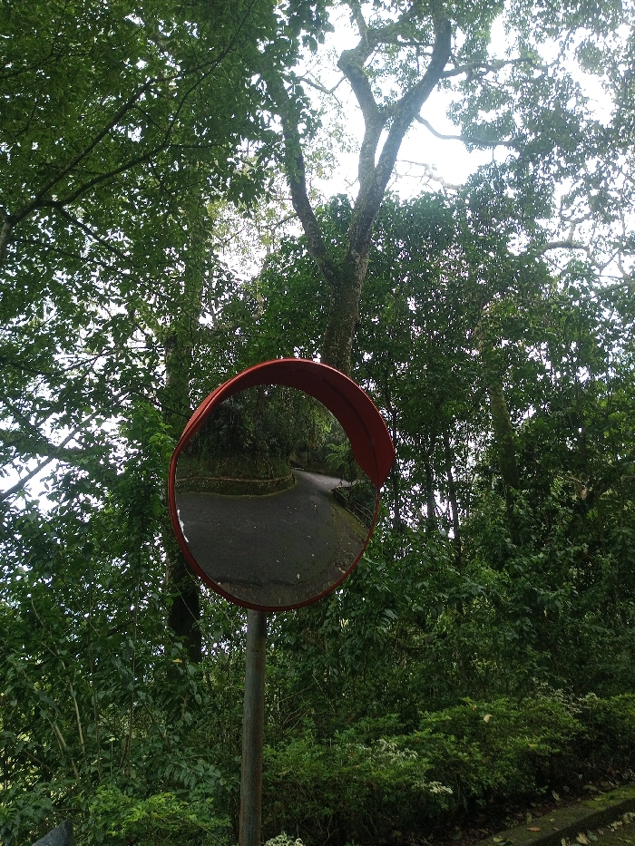 - "A circular convex traffic mirror, featuring a prominent red frame, is affixed to a weathered grey metal pole positioned centrally in the frame" by FM-ltSLb2, licensed under CC BY 4.0