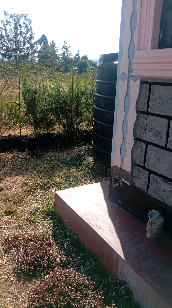 A black water tank stands next to a building corner featuring decorative stonework and a peach-colored frame. The ground slopes gently and is covered in dry grass and small clumps of flowering plants with dark pink blooms. In the background, shrubs are bordered by fresh, dark soil, and trees dot the distant landscape under a clear, bright sky. A concrete platform extends from the building, partially shaded. A rusty pipe outlet is visible on the platform's edge.