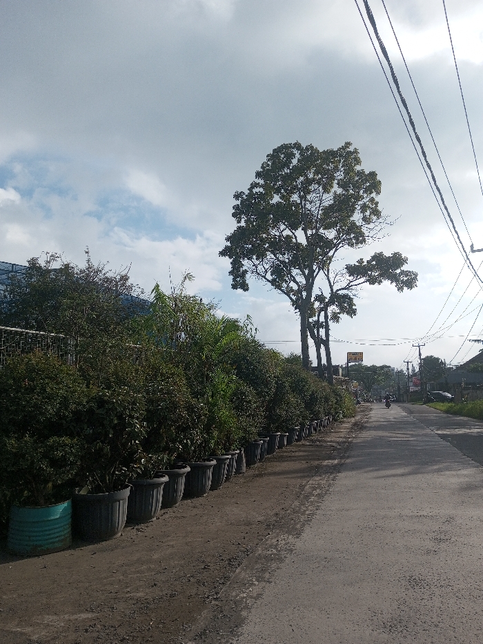 A road stretches into the distance, flanked by a row of potted plants and lush greenery on the left. A large tree stands further down the road. Overhead power lines crisscross the sky, which is filled with white clouds against a blue backdrop. A motorcycle drives on the road. Houses and buildings are visible in the background.