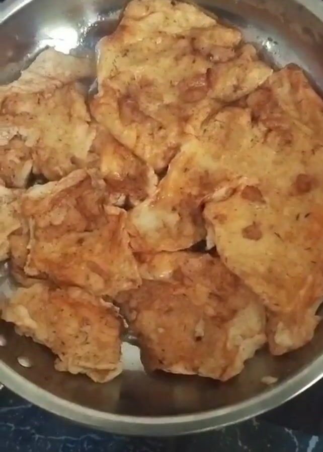 A well-lit video shows someone cooking. The scene is a close-up of a stainless steel skillet filled with light golden, browned fried pieces of food on a black marble or granite countertop. A hand is visible using a spoon or spatula to stir and move the food in the pan. There is also a red wire or cable in the background. The sound of a TV or radio playing is also audible in the background.