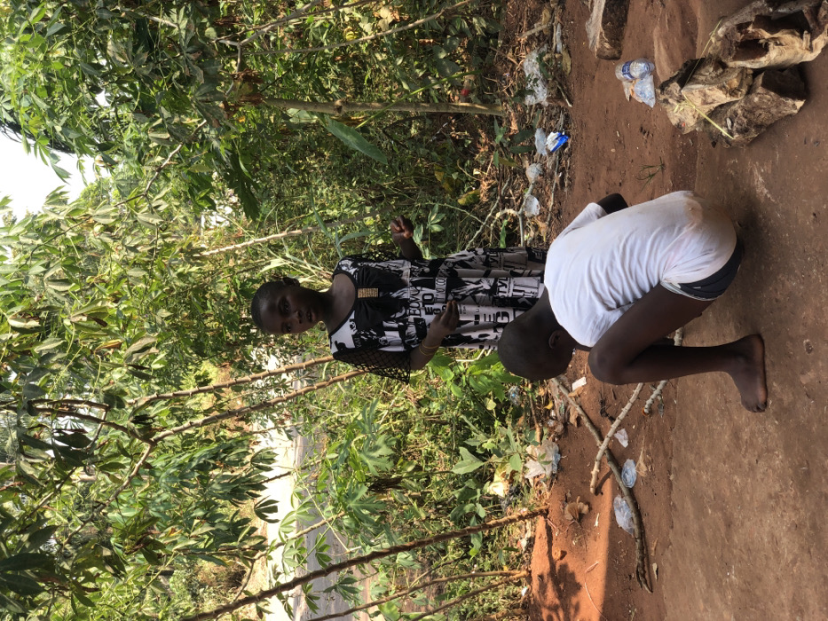 The image depicts an outdoor scene in Neni, Nigeria, featuring two young individuals and dense vegetation. In the foreground, a young male is crouched on reddish-brown dirt, facing away from the camera and looking downwards. He wears a white t-shirt and dark-colored shorts, and is barefoot. Scattered sticks and plastic debris are on the ground around him. Behind him and slightly to the right, a young female stands, looking towards the left side of the frame with a neutral expression. She wears a black and white patterned dress with a bow detail on the chest and mesh sleeves; gold-colored bangles are visible on her left wrist. The background is dominated by lush green foliage, primarily cassava plants, with individual leaves and stems clearly visible. A faint indication of a paved surface or road can be seen through the vegetation in the upper left background. Additional plastic litter, including bottles and bags, is scattered across the dirt ground. On the far right, a small stack of cut wood is visible. The scene is illuminated by natural light.