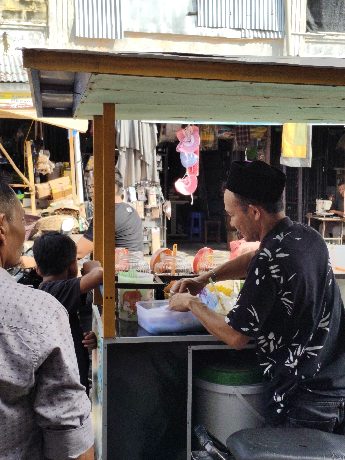 The image displays an outdoor scene in Wilayah Administrasi Gp. Mns Blang Sakti, Indonesia, centered on a street food vendor preparing items at a mobile cart. A male vendor, wearing a black peci and a black shirt with white floral or leaf patterns, is positioned behind a light blue wooden cart. He is actively engaged in mixing or preparing contents within a clear plastic container on the cart's surface. To his left, several clear plastic jars holding orange-colored ingredients are visible. On the left side of the frame, a male customer is seen from behind, wearing a light grey patterned collared shirt, facing the vendor. A young male child stands partially visible between the customer and the cart, also observing the vendor's actions. The background features a bustling market environment with multiple blurred figures, various retail stalls displaying merchandise such as clothing and decorative items, and building structures with corrugated metal siding. A white bucket with a green lid is visible beneath the vendor's counter, and a portion of a motorcycle seat is present in the lower right foreground.