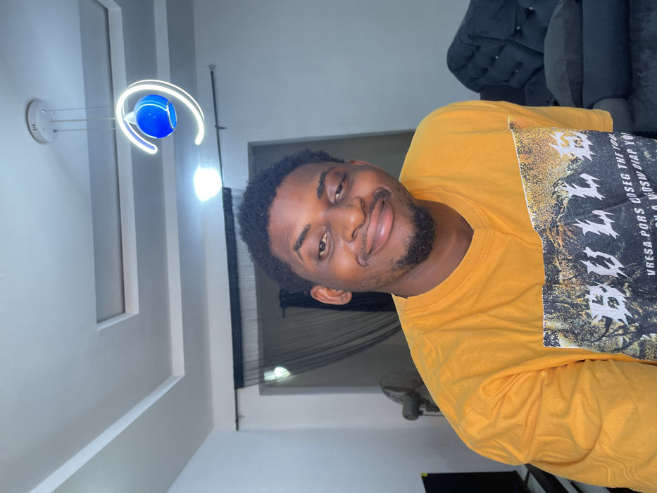 A young man smiles at the camera, holding a printed graphic tee. He wears a yellow long-sleeved shirt. Behind him, a grey couch is visible. The background includes a window with dark curtains and a ceiling fan. A modern light fixture with a blue spherical element hangs from the white ceiling. The room appears brightly lit.