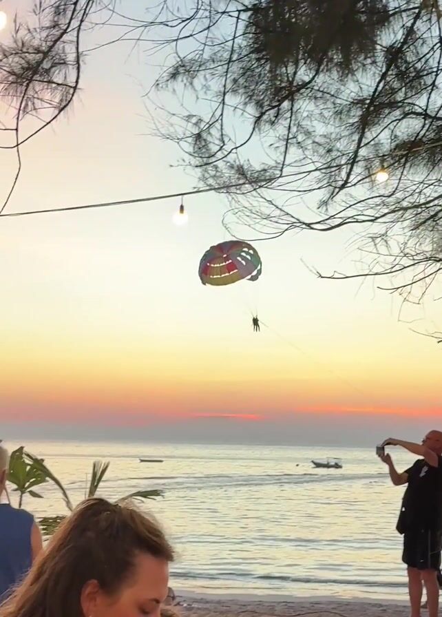 beach scene at sunset. In the foreground, people are sitting around a table eating at an outdoor restaurant. The table is covered with a patterned tablecloth and various bottles and condiments. The sky has a gradient of colors, from yellow near the horizon to orange and pink higher up. A parasail with two people is visible in the sky, being towed by a boat in the ocean. Several other people are walking on the beach. A man is standing on the beach, taking a photo of the parasail. Some bare tree branches hang over the scene. String lights are also strung between the trees.
