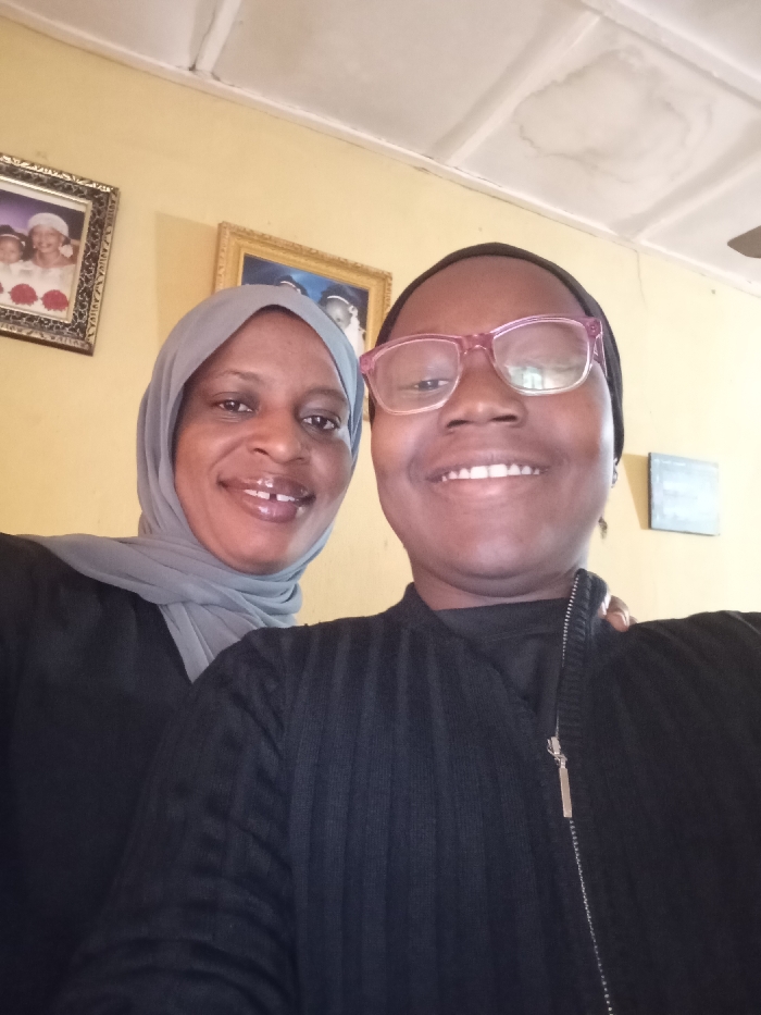 Two women smile for a close-up selfie indoors. The woman on the left wears a gray hijab and a dark garment. The woman on the right wears pink glasses and a black zip-up top. Both have warm smiles, revealing their teeth. Two framed pictures hang on the yellow wall behind them, with a small blue square below the right frame. The ceiling appears to be made of square panels.