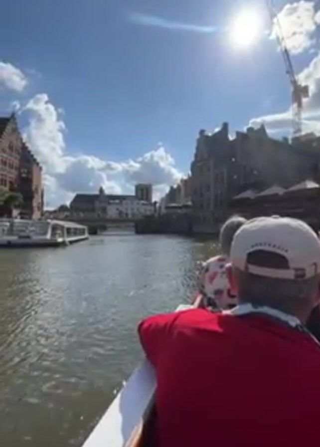 boat tour on a river in a city. The camera is positioned on the boat, facing forward. In the foreground, the back of a man in a red shirt and a white cap can be seen. Behind him, other passengers are partially visible. The boat is moving through a canal or river with buildings lining both sides. The buildings are old and appear to be made of brick with distinctive architectural details. Several boats are docked along the riverbank. In the distance, a bridge and a tower can be seen. The sky is blue with scattered white clouds, and the sun is shining brightly, creating a glare. A construction crane is visible in the background.