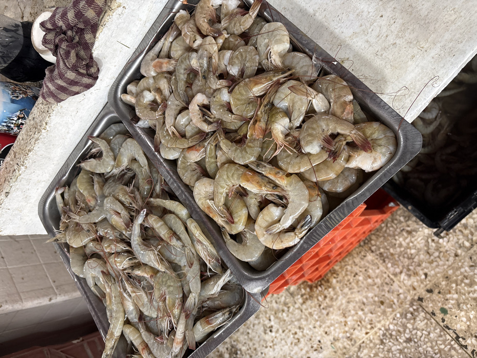 - "Two silver trays overflow with raw shrimp, varying slightly in size and color" by FM-21Qs12, licensed under CC BY 4.0