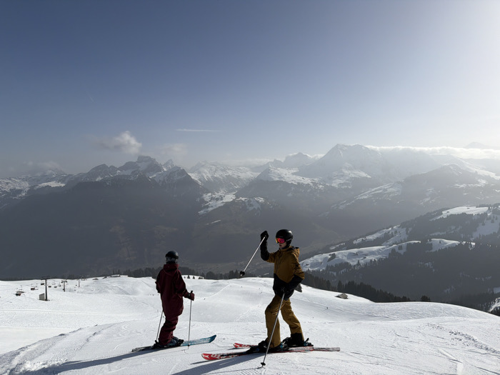 Two individuals, equipped for skiing, are positioned on a groomed, snow-covered mountain slope within the ski area of Zweisimmen, Switzerland