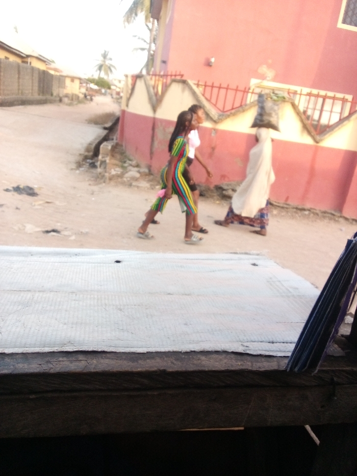 Three women walk along a dirt road in front of a pink and white building. Two are dressed in Western clothing, while one wears a white head covering and carries something on her head. Other buildings and a palm tree are visible in the background. The lower part of the image shows the edge of a wooden surface, partially obscuring the scene.