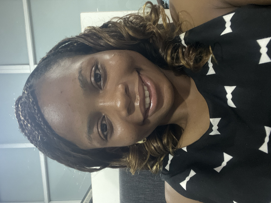 The image displays a close-up, chest-up selfie of an adult female in an indoor setting. The individual has a dark skin tone and dark hair styled with braids on the crown and curly sections in shades of brown on the sides, extending to the shoulders. She is smiling directly at the camera, revealing teeth. She is attired in a black sleeveless top patterned with repeating white bow-tie shapes. In the background, a dark gray, textured object, possibly a chair back, is visible to the left. Beyond this, light-colored wall panels or frosted glass partitions with horizontal frames are discernible, indicating an office or professional environment. No other individuals are present. The scene is located in Ikeja, Nigeria.