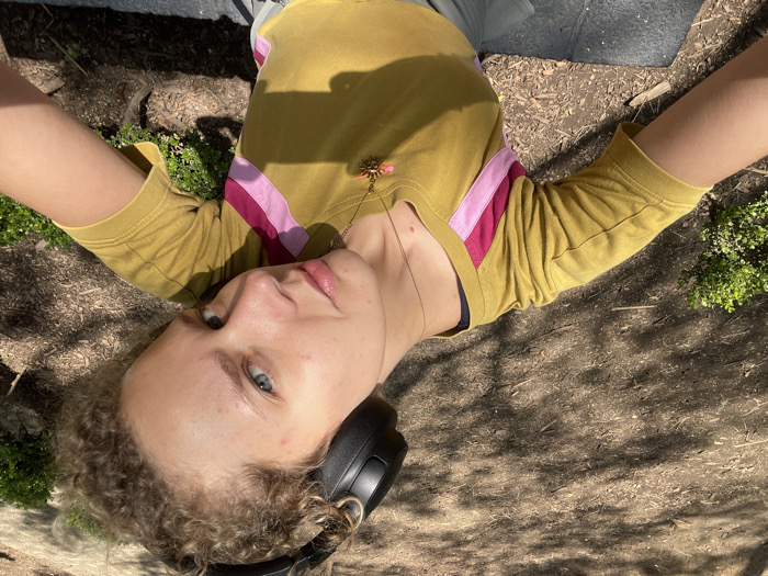 A young individual with fair skin, curly light brown hair, and blue eyes is depicted in a high-angle selfie, looking directly at the camera with a neutral expression. They are wearing black over-ear headphones and a mustard yellow short-sleeved t-shirt with pink and darker pink diagonal stripes across the chest. A thin gold-colored necklace with a small, multi-colored pendant is visible around their neck. The outdoor background consists of dry, brown earth with scattered small green bushes and distinct shadows from overhead foliage, indicating bright sunlight. A dark grey surface is present in the lower foreground. The scene is located in Mexico City, Mexico.