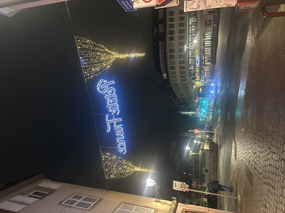 A street scene at night features Christmas decorations strung above
