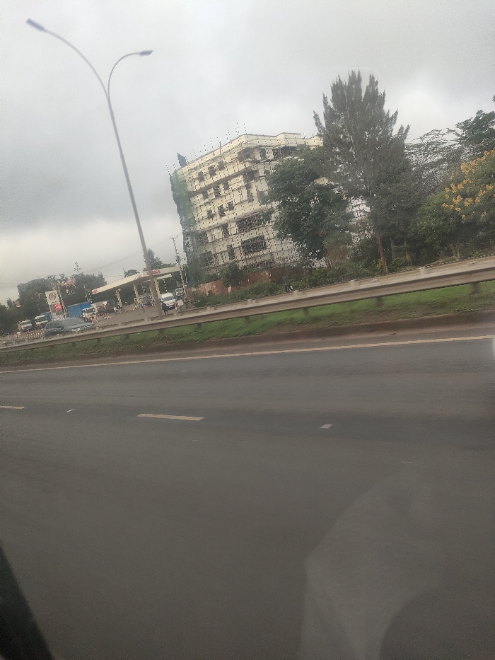 An exterior image captured from a moving vehicle displays a multi-lane asphalt road in the foreground, featuring white dashed lane markings. A grey metal guardrail separates the road from a grassy verge and a row of trees to the right. Beyond the trees, a multi-story building, approximately five to six floors tall, is under construction, evidenced by visible scaffolding on its facade and green safety netting on its left side. To the right of the building, a "TOTAL" branded gas station is visible, featuring a white canopy, several fuel pumps, and multiple parked vehicles, including a white van. A tall street light with two luminaires on a curved arm is positioned on the left side of the frame, extending towards the upper left. The sky is overcast and light grey, indicating cloudy conditions. This scene is located in Gatongora ward, Kenya. No specific individuals or distinct interactions are clearly discernible due to distance and image resolution.