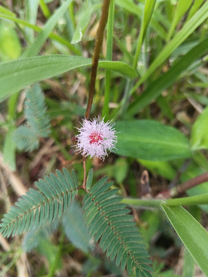 - "The image displays a close-up, macro-level view of a single Mimosa Pudica flower and its associated foliage" by FM-QlAdj2, licensed under CC BY 4.0