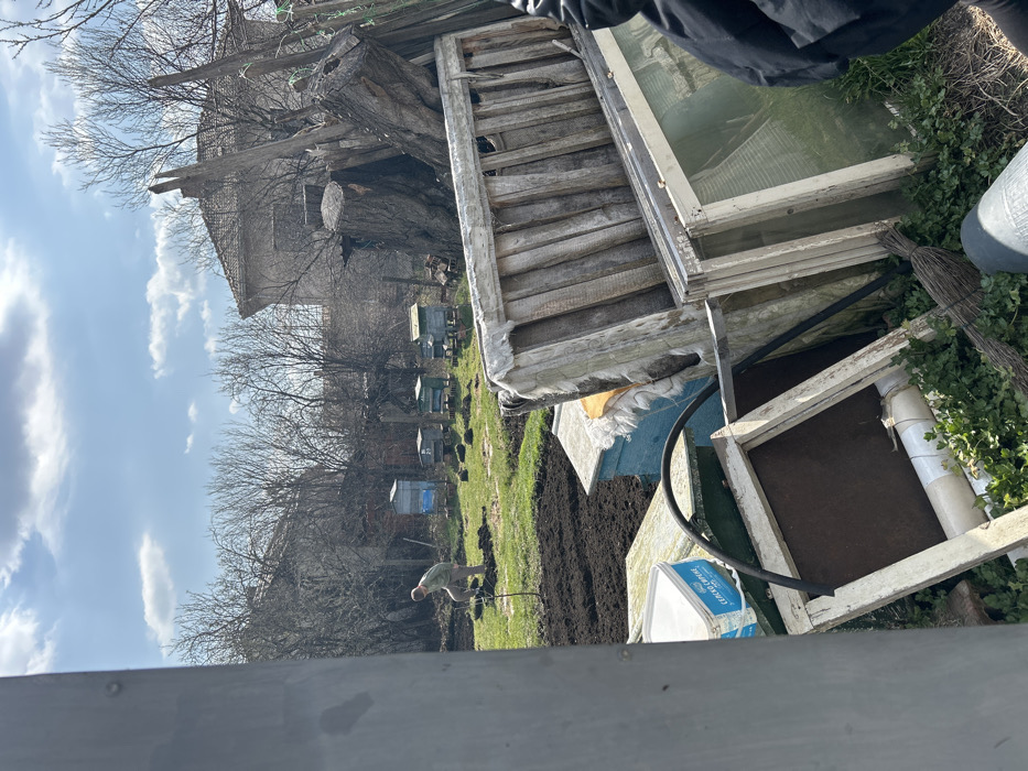 The image depicts an outdoor scene in Slivnitsa, Bulgaria, under a bright, partly cloudy sky. In the mid-ground, a male individual in light-colored attire stands in a patch of dark, tilled earth, holding a shovel as if gardening or planting. A small sapling is visible near his position. To the right of this tilled area, a series of at least five beehives, painted in various hues including blue and green, are arranged on elevated platforms within a grassy field. The background features numerous bare deciduous trees and several residential buildings with tiled roofs. The foreground on the right side of the image is occupied by a collection of discarded materials, including multiple wooden window frames, some containing glass panes, a broken wooden panel or door segment with white fibrous material, a black hose, and a twig broom, resting on ground covered with green vegetation.