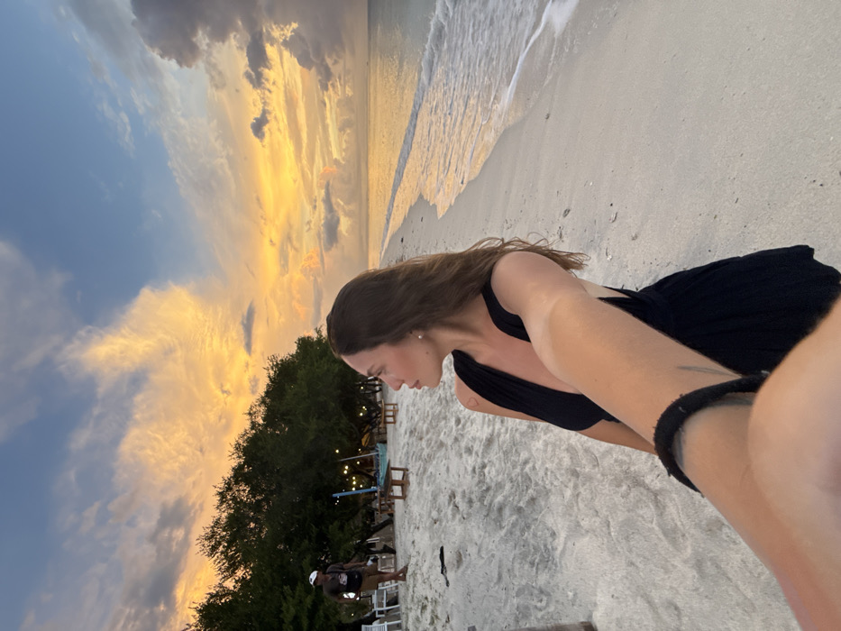 A wide-angle selfie depicts a beach scene at sunset in the city of Unknown, Indonesia. In the foreground, a female with long brown hair, fair skin, and a small red heart tattoo on her left shoulder, wears a deep V-neck black sleeveless garment. She extends her right arm towards the camera, a black hair tie visible on her wrist, while her head is turned to the right, looking towards the horizon. A white stud earring is visible in her left ear. The environment consists of a light-colored sandy beach that extends to the midground, meeting the ocean on the right. Gentle waves break along the shoreline. The sky above is characterized by a sunset, with clouds displaying vibrant orange, yellow, and pink hues across the center, transitioning to blue and darker grey clouds at the upper edges. Along the left side of the beach, a dense line of dark green trees runs parallel to the shore. Beneath these trees, several light-colored wooden tables and chairs are arranged on the sand. Blue string lights are visible among the trees and structures. Further back on the left, a male subject with darker skin, wearing a white cap, dark shirt, and shorts, stands near the trees and furniture, appearing to hold an object in his left hand. The ocean water reflects the warm tones of the setting sun.