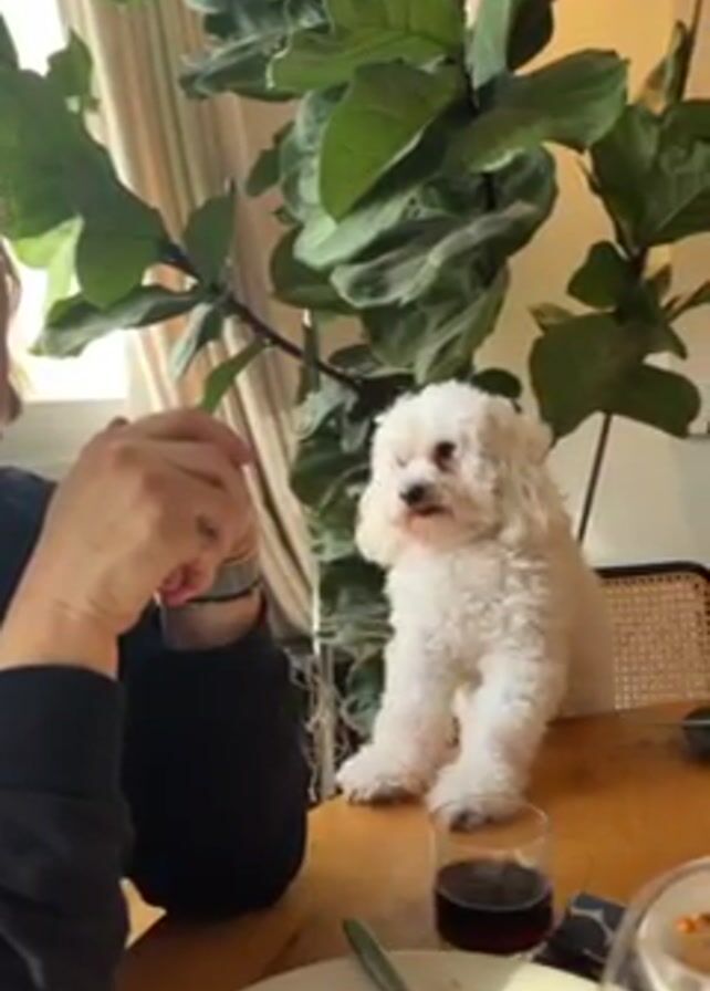 A person is seated at a wooden table in front of a large leafy plant. The person is wearing a black long-sleeved shirt. Their hands are visible, and they appear to be manipulating a small object, possibly a salt or pepper shaker. A small white dog is perched on a chair at the table, its paws resting on the tabletop. The dog is looking towards the person and licks its nose. A glass of red liquid and a plate with remnants of food are also on the table. The setting appears to be a dining room or similar space, possibly a home or restaurant.