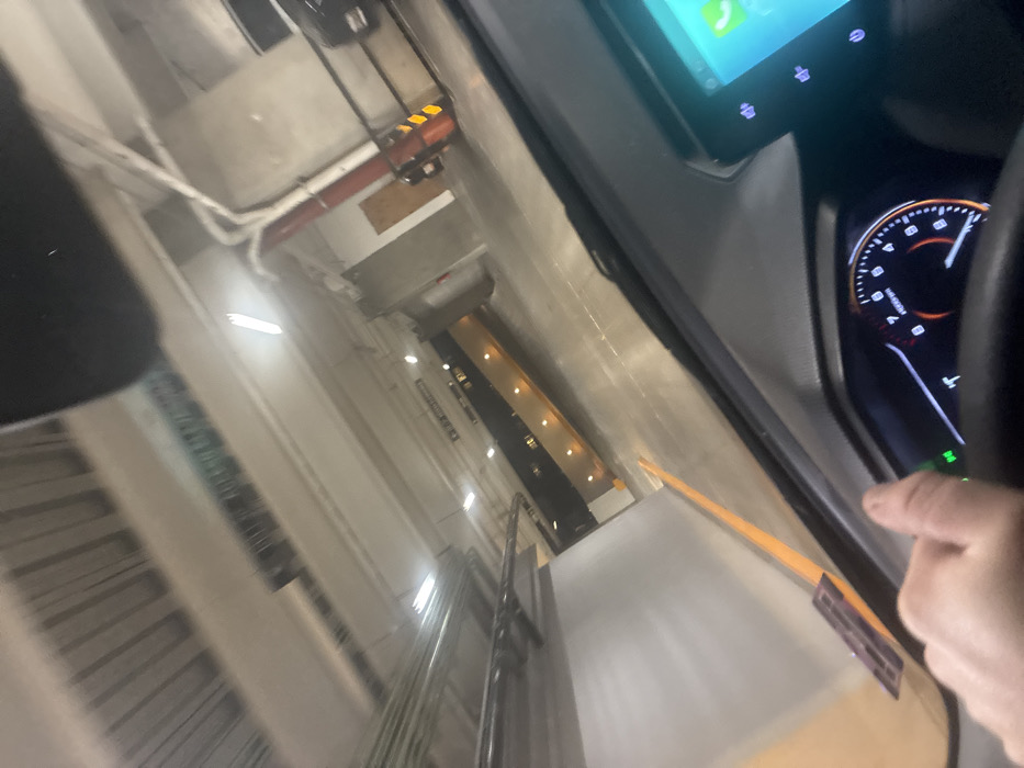 The image depicts the interior of a multi-level parking garage in Huixquilucan de Degollado, Mexico, observed from the driver's perspective of a stationary or slow-moving vehicle. The view extends forward through the windshield, which exhibits a slight reflection of the ceiling. In the immediate foreground, the top section of a vehicle dashboard is visible, along with a steering wheel segment. A bare left hand, with the thumb visible, rests on the lower-left portion of the steering wheel. To the right of the steering wheel, a digital instrument cluster is partially visible, showing a tachometer scale marked from 1 to 8 (likely representing RPM x 1000). A green indicator light is illuminated on the instrument panel. Further to the right, a portion of a large digital infotainment screen displays several application icons, including a prominent green phone icon and a purple icon. The midground and background reveal the concrete structure of the parking facility. The ceiling, painted a light color, features exposed utility conduits (some light green, some white) and evenly spaced rectangular fluorescent light fixtures. Water stains or discoloration are visible on sections of the ceiling. Concrete support pillars are present throughout the structure. The floor is light-colored concrete with a distinct yellow painted line marking a pathway on the left side of the vehicle's trajectory. Towards the right side of the image, a red vertical pipe, possibly a fire suppression riser, is visible adjacent to a black metal railing equipped with yellow and black striped impact protection. A dark-colored vehicle is partially observable behind this railing. In the distant background, a downward-sloping ramp or corridor is illuminated with warm, amber-toned lighting along its lower walls, contrasting with the darker upper sections of the ramp. Distant signage is visible on the ceiling, but the text is unreadable due to blur and distance. The overall lighting is artificial and functional, consistent with an enclosed parking environment. The image exhibits minor motion blur.