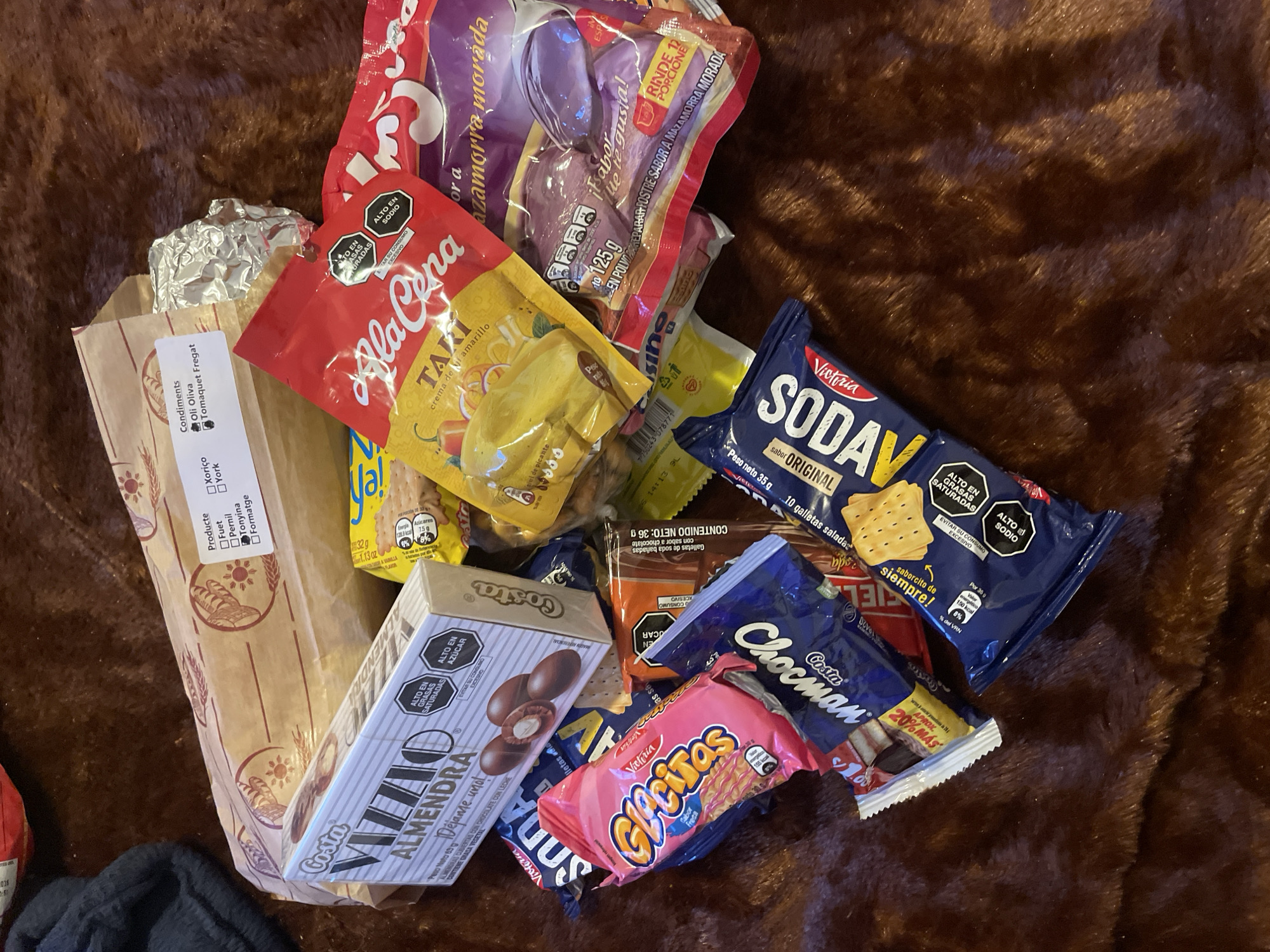 The image presents a high-angle, close-up view of an assortment of packaged food products and a paper bag, meticulously arranged on a dark brown, textured surface resembling faux fur. The central object is a large, light brown paper bag, likely for a sandwich or bread, featuring wheat stalk and bread loaf illustrations. A white label affixed to this bag lists "Producte" (Product) options like "Fuet," "Pernil," "Tonyina," "Formatge," "Xoriço," and "York," alongside "Condiments" such as "Oli Oliva" and "Tomaquet Fregat." Clustered around the bread bag are multiple retail food items. These include a white box of "Costa Vizzio Almendra" chocolates, displaying "Alto en grasas saturadas" and "Alto en azúcar" warnings. A red and yellow packet of "Ala Cena" Taki "crema de ají amarillo" (yellow chili cream) is visible, along with a red and purple packet of "Mazamorra Morada" powder mix, indicating a 125g net weight and "Rinde 12 porciones." Other prominent items are a pink packet of "Victoria Glicenas" strawberry-flavored wafers, a blue packet of "Costa Chocman" chocolate biscuit, and several blue packets of "Victoria Sodav Original" salted crackers, which include "Alto en sodio" and "Alto en grasas saturadas" alerts. A small, crumpled piece of aluminum foil is situated near the bread bag. The scene is strictly indoor, illuminated by an unseen light source. No individuals are present, nor are any actions or interactions depicted. The products, particularly the labeling in Spanish and Catalan, are consistent with items sold in Spain. While the products could originate from a local supermarket or store in Canet de Mar, Spain, the precise indoor location within the city is not identifiable from the visual content provided.