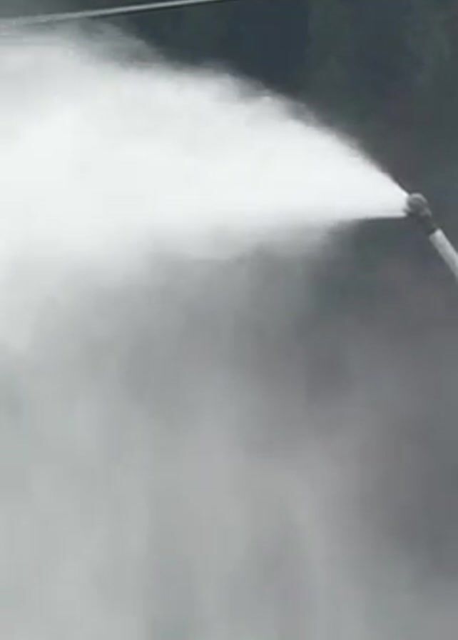 A video shows a snow cannon shooting a plume of white mist to the left with a ski lift in the background