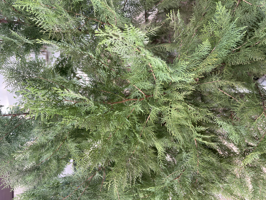 This image, taken in Giginyu, Nigeria, presents a close-up, vertical view of dense green coniferous foliage
