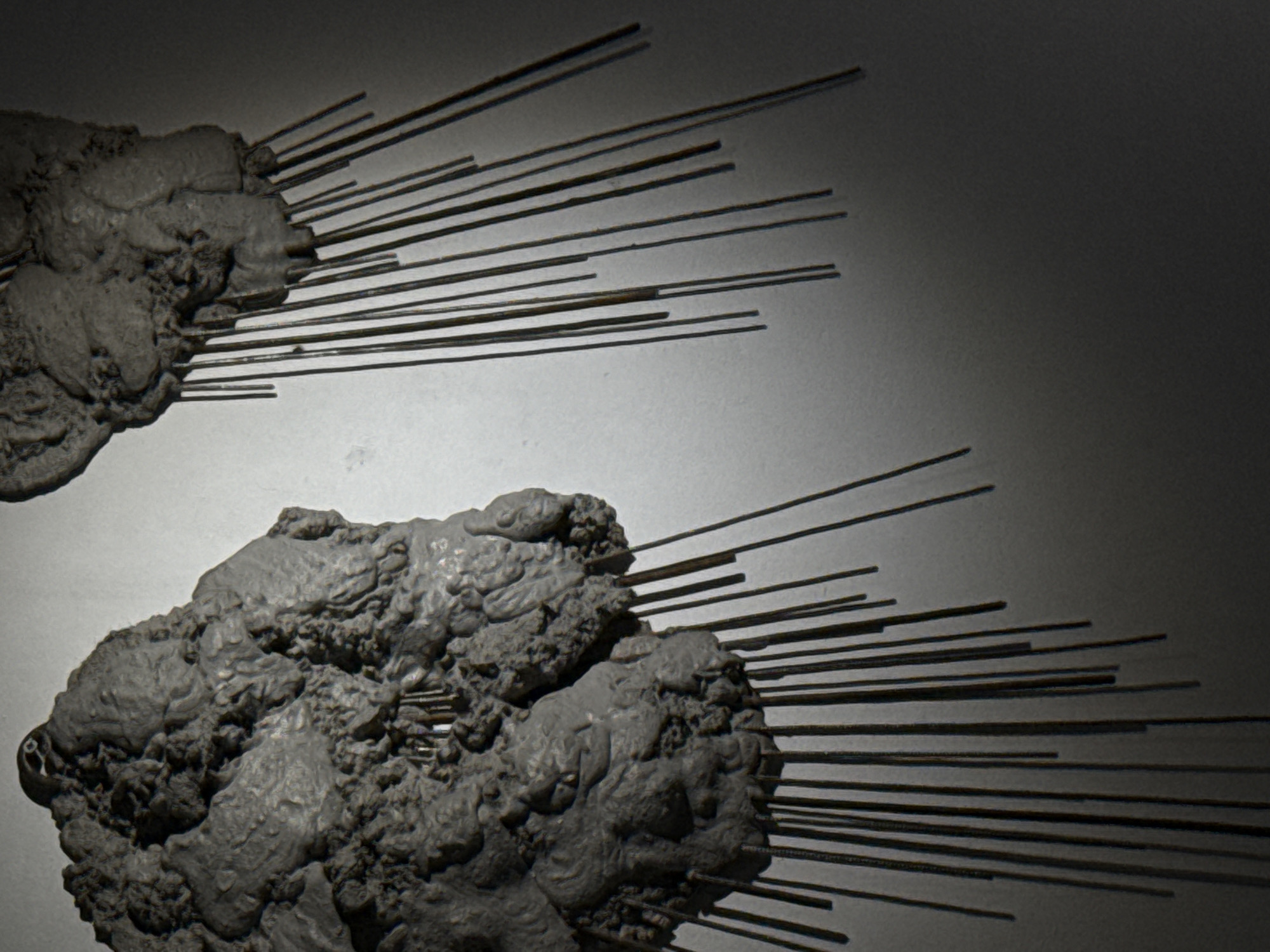 The image features an indoor sculptural installation located within an unidentified exhibition space in Moscow, Russia. Two large, irregularly shaped masses, dark gray in color and possessing a highly textured, organic-like surface, are affixed to a plain light gray wall. From the underside of these masses, numerous slender, dark, cylindrical rods protrude downwards at various lengths and angles. The larger mass is positioned in the upper-left portion of the frame, while a smaller mass is partially visible in the upper-right. The wall behind the artwork exhibits a gradient of illumination, being brighter in the upper-left and gradually darkening towards the lower-right. There are no individuals or discernible actions depicted.