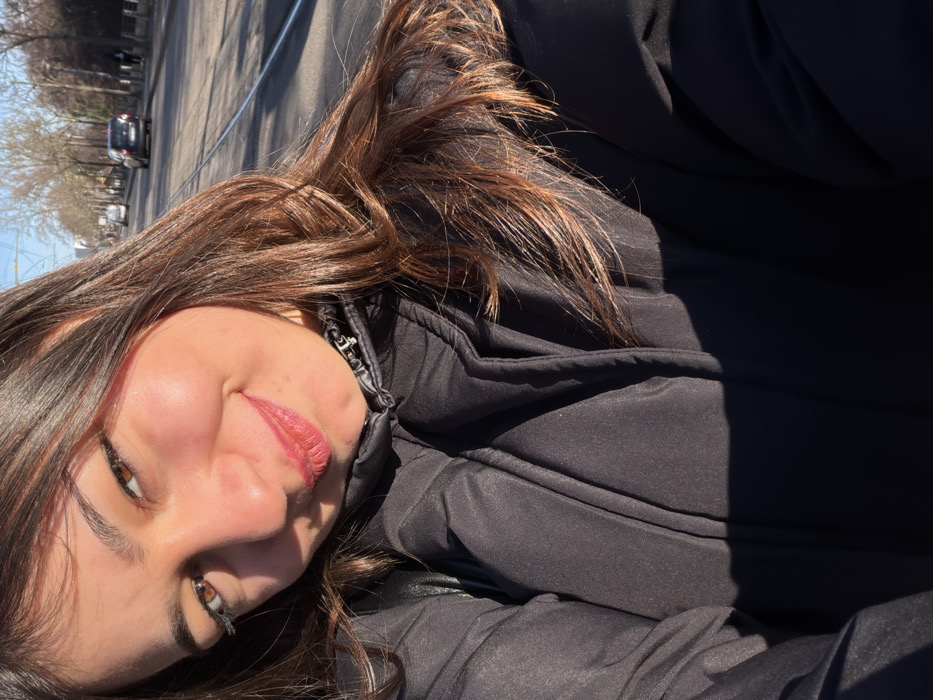 An outdoor, sunlit portrait features a young woman centered in the frame. She possesses long, brown hair, brown eyes with visible eyeliner, and is wearing red lipstick, exhibiting a slight smile directed towards the camera. Her attire consists of a dark, likely black, puffy winter jacket. Direct sunlight illuminates her face from the right, casting distinct shadows across her lower left face and the left side of her jacket. The background depicts an urban street in Schiltigheim, France, under a clear blue sky. A paved road features distinct tram tracks running down its middle. Bare deciduous trees line both sides of the street, and several passenger vehicles are observed in the distance, traveling away from the camera.